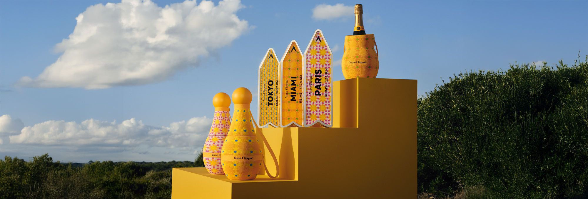 Insieme alle Arrow ti presentiamo anche le altre Limited Edition per portare la gioia di Veuve Clicquot sempre con te: Yellow Label Sun Holder, Yellow Label Sun Totem e Rosé Sun Totem by Yinka Ilori.